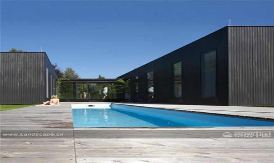 装有狭长水池的露台嵌在两座建筑中,因此通风和私密性得到了保护。可通过厨房进入到室内,起居室和门厅同样可作为父母的卧室。