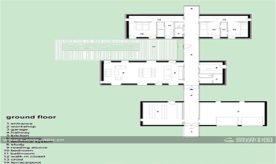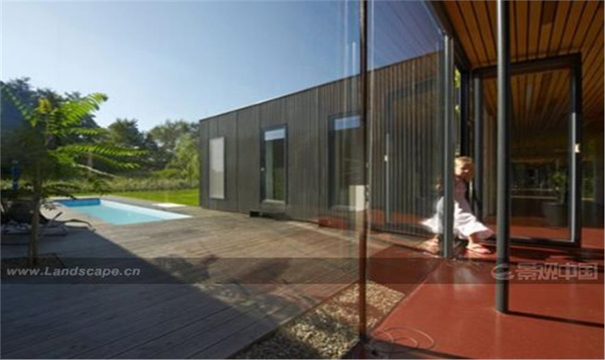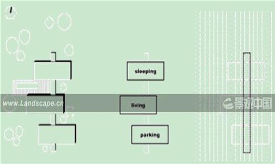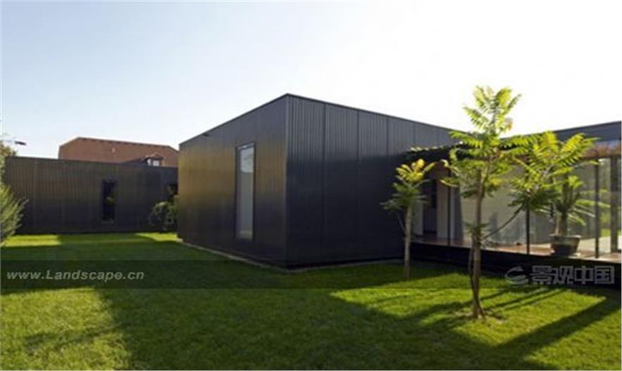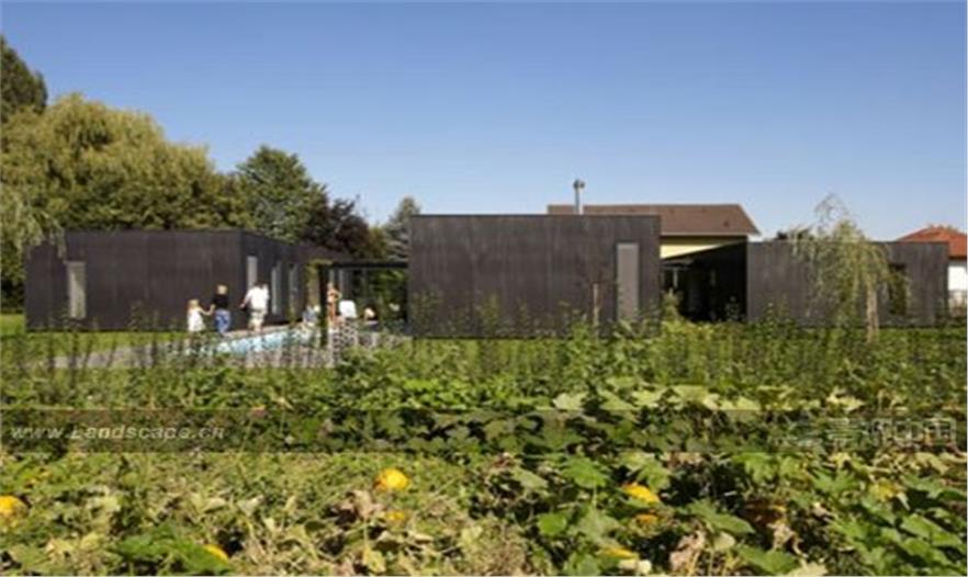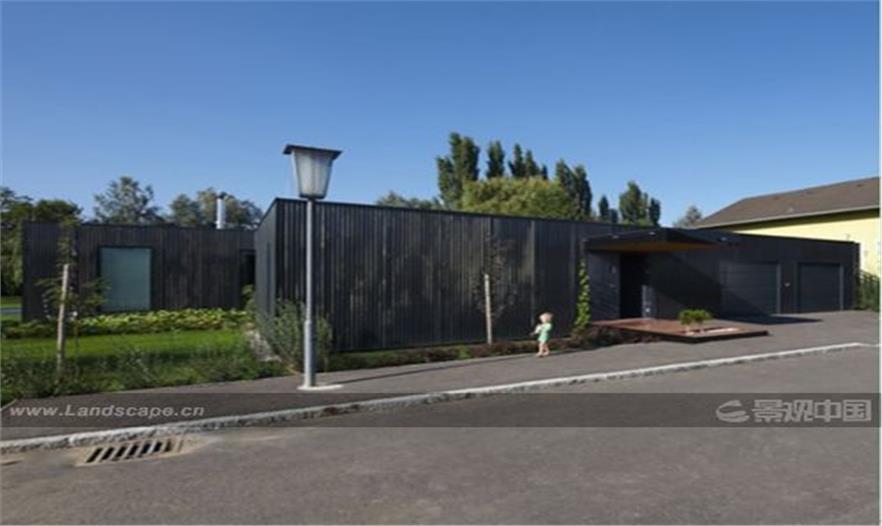 不同类型的功能可归纳为三种类似于“容器”的结构。街道处的主入口以顶棚形式出现以达到标识效果,通向全封闭的玻璃通道,在花园一侧以出挑台的形式结束。车库和储藏室位于三种“容器”中的第一个,起居室位于第二个“容器”中,可从三面获得自然光。连接两个“容器”的连廊则作为门廊。一个蔬菜园直接同厨房相连。