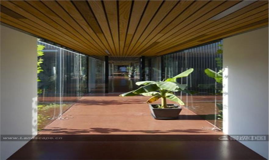 所有的起居室都安装地暖。水通过一个地热收集装置和两台热泵进行加热。走道由开放和封闭的序列构成,让人能够时刻看到半开放的庭院和每个容器。客户是个酿造葡萄酒的业余爱好者,玻璃连接通廊的两侧恰好适宜栽种葡萄,自然形成了一片生长在房子中的葡萄园。