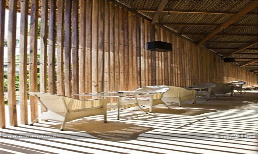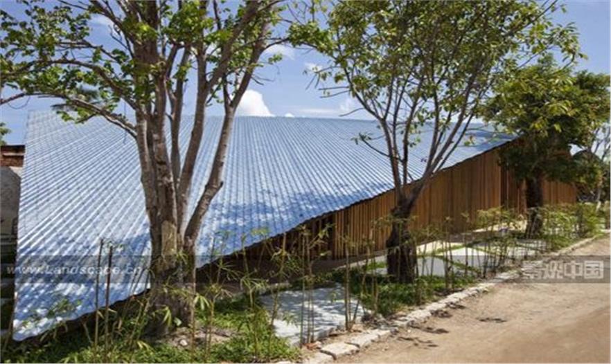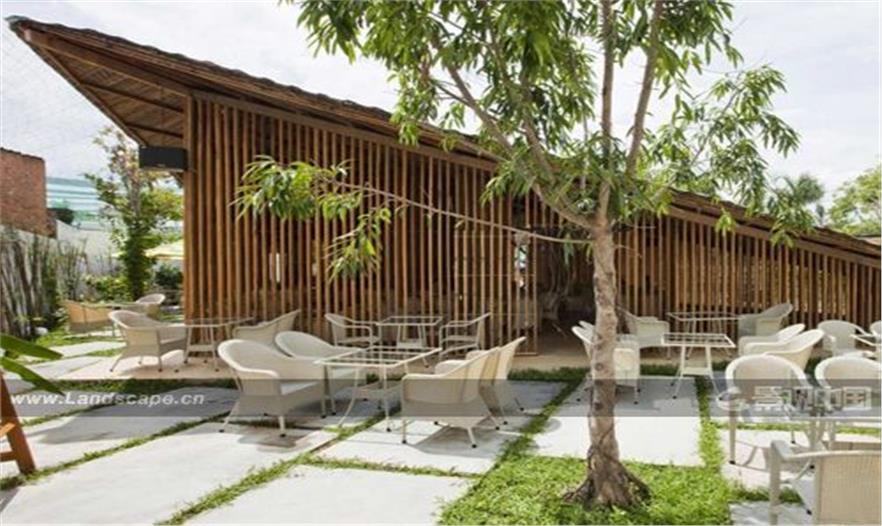 咖啡店位于不十分时尚和整洁的居住区里,因而屋顶的设计非常仔细,以控制和提供最好的视域。屋顶共有三层:椰子树叶——最低的一层;盖瓦层——中间层和最高的渔网层。将来这个屋顶会被植物覆盖而成为一个绿色屋顶。