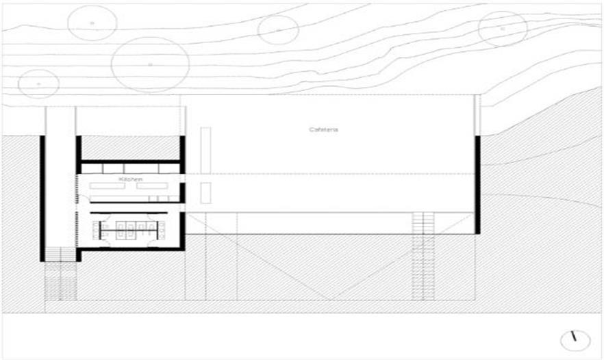 咖啡厅隐藏在下方的山体之中,需要拉开滑动的地板,通过一个单独的楼梯下达,因此人们在地面上完全看不见咖啡厅,咖啡厅里的大玻璃幕墙也保证了这里有着非常良好的景观视线。两个毫不突出的建筑,巧妙的融入峡谷,让人们饱览胜景。