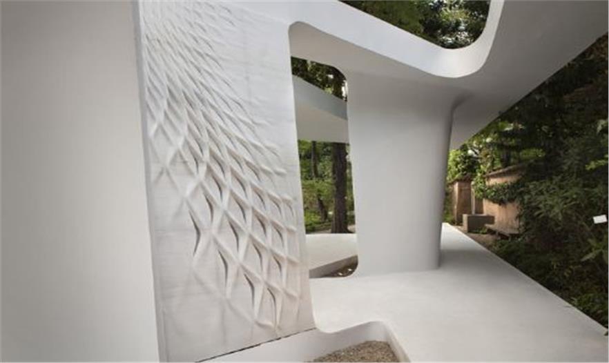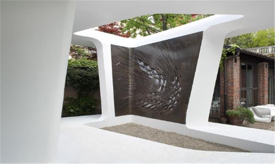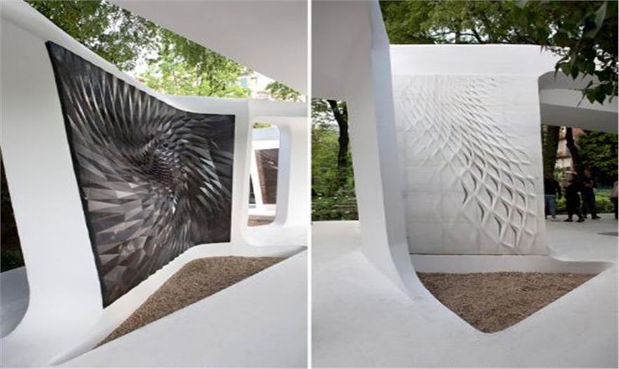 建筑师Zaha Hadid设计的亭子有着三个不同镶嵌大理石表面的墙,那些不规则多尺寸的大理石三维拼图形成强大的冲击。亭子的造型非常有机,融入周围环境,同时又将大理石的冲击力表达出来, 既有内涵又有分量。大理石的复杂美丽的花纹由自然世界生成,那些迷人的图案和地址息息相关。