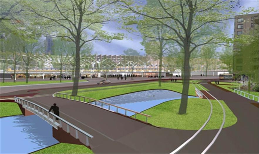 该工程将同时在鹿特丹中央车站前面形成绿色广场,桥梁设计属于整体城市规划的一部分。桥体的造型将根据当地浪漫折衷的特色进行设计。