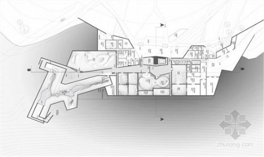 挪威设计事务所snøhetta最近因拉斯科洞窟参观中心的投标设计获奖,参观中心位于法国蒙提涅克,维泽尔河谷边界的山坡上,一边是茂密的森林,一边是人工种植的田地。这座建筑内陈列的是史前艺术家刻画在天然石壁拱顶上的岩画,如同这些史前人利用石头的纹理和裂缝来表达他们的艺术一样,建筑师也将入口设计在沿着地面景观延伸的裂缝中,展示着这块土地的微妙复杂。玻璃幕墙随着外部环境的变化而变化,公共服务空间就位于玻璃幕墙之后,能够获得大量自然光线。展览空间位于地底的更深处,参观者沿着古代人留下的路径走向地下才会看到展览空间。整个建筑庄严而安静,有繁茂的树木,有广阔黑暗中的点点亮光和粗糙的岩石表面,这些元素都复活了原来洞窟的气氛以及那些宝贵岩画的精神。