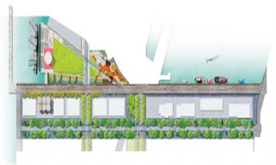 宽阔的中央草坪用来举行一系列的娱乐活动和各种比赛项目。倾斜的拐角像堤岸一样,能够防止工业筒仓泄漏,这暗示了建设地点原有的用途。与此相邻的区域是一片广袤的生物滞留湿地,这里贮藏了广阔建设地点所积攒的雨水,最终通过巨大的水楼梯像瀑布一样倾斜到海港中。这些楼梯由可回收利用的预制混凝土部件构成,之前它们用于储存制造材料——当地的结构再一次得到回收利用,用来建造一个全新的结构。