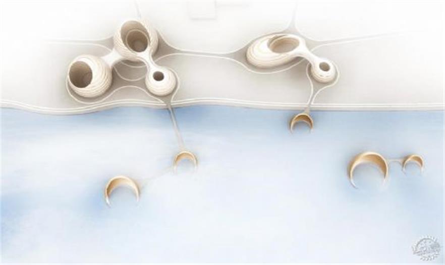 对于这种海边建筑物聚合形状的构思设计也是源于沙漠,因此这些建筑在沙漠地带具有可实现性。这个设计思路是来源于在海边生活的必要自然构成要素:太阳、风和任何形式的自然元素。他们是基于当代大都市的演变、为未来所存在。这种构成方式将人与人之间的关系进行了延展,在日常生活中将数以千计的公用空间进行整合,与20世纪和21世纪的城市进行剥离。