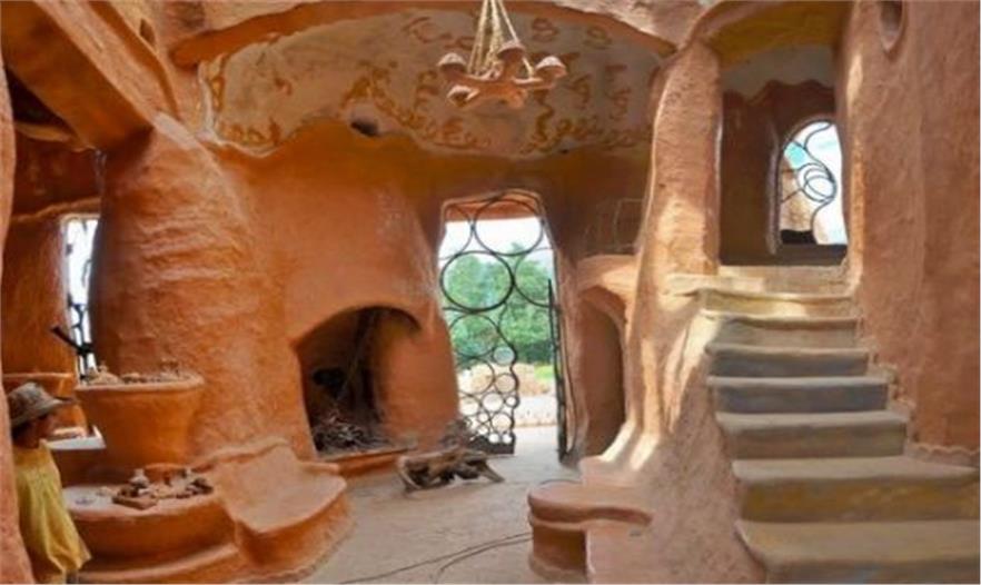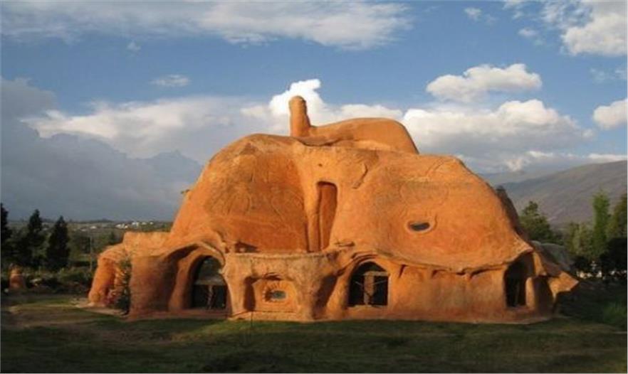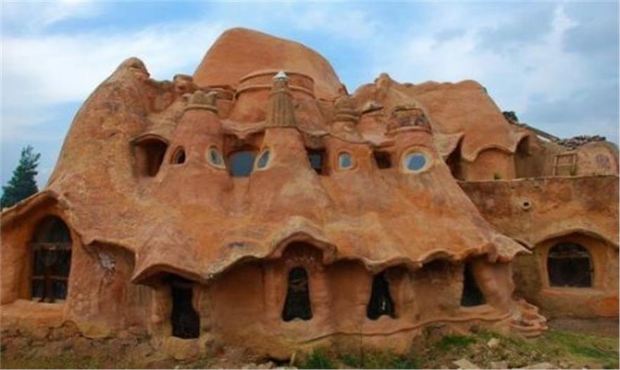 从外表上看 Casa Terracotta 就像是用泥土堆砌起来的大土屋。以山脉作背景,周围还围绕着农田。房子里面的线条都呈流线型,就像是一个大模型。这间粘土屋里还有一些现代设施,比如太阳能热水器、马桶、铺满五颜六色的马赛克的墙壁,二楼还有客厅和卧室以及一个多功能的厨房。当然厨房的台面以及其他物品都是用粘土制成的。