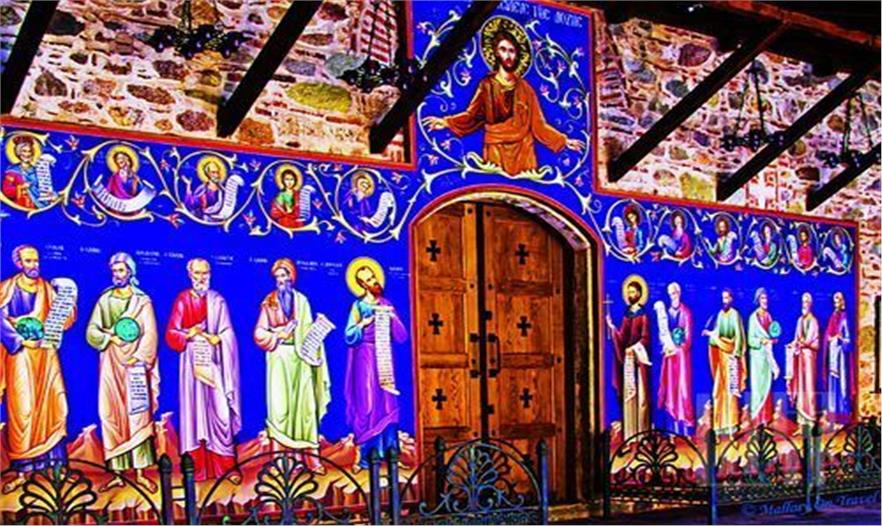 离k村最近,始建于1388年,二战期间遭到劫掠和破坏而日渐颓败,1960年当地政府重新投资修缮。由于坐落的岩石面积不大,设计紧凑,与山岩几乎融为一体,堪称建筑设计奇迹。壁画是希腊著名画家塞奥法内斯1527年绘制,是迄今能见到有其签名的最古老的壁画。周五不开放。