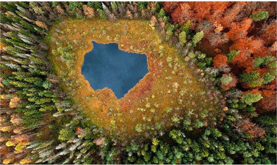 空拍波兰森林湖的由绿转红、由外而内的美丽变化。