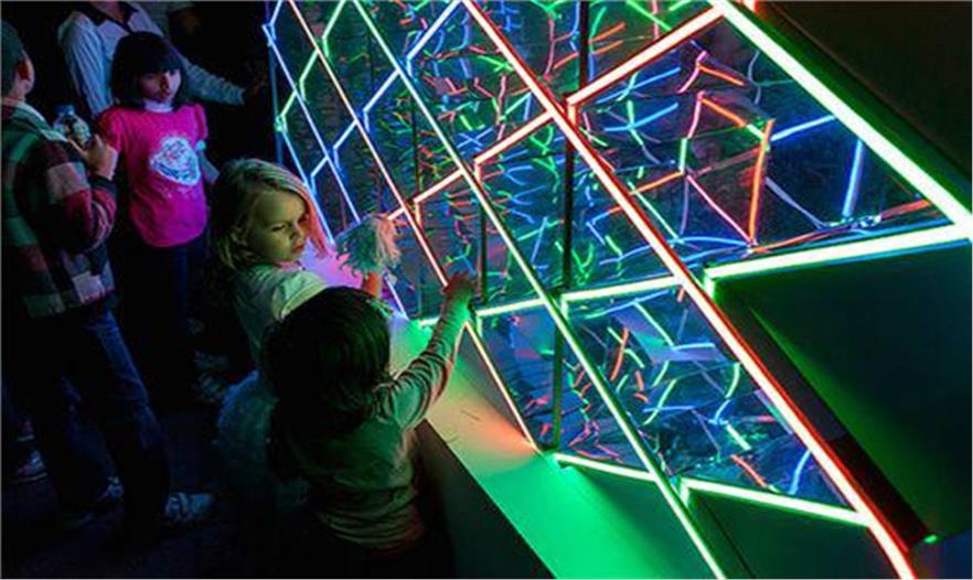 Rathod的这个4英尺深的Kaleido Wall是由覆盖在反射板上的格子组件构成,来反射灯光和运动,创造出颜色的变换。这个结构运用了周围的灯光反射资源,在白天或是夜晚都能看见。这个装置能反射出悉尼港的即时景象,让游客在小型的拼图结构中观赏到标志性建筑物——悉尼歌剧院。