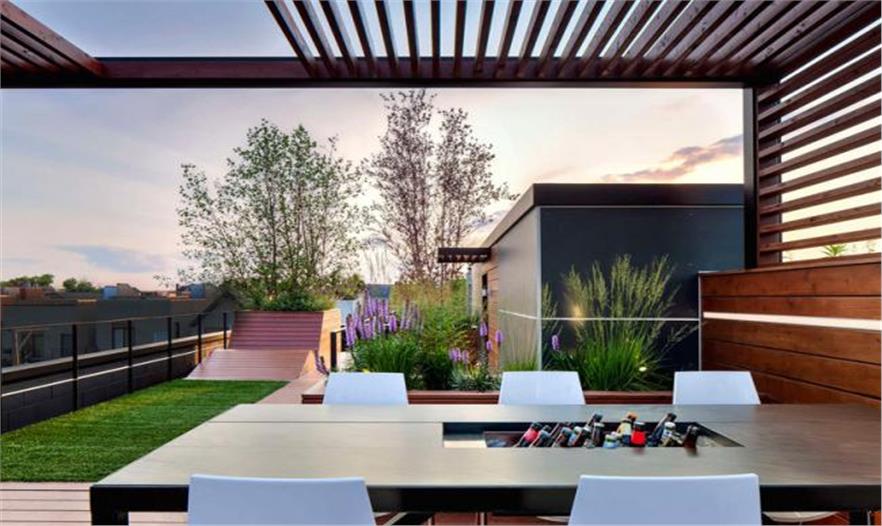 百叶窗式的藤架框出美妙的城市景色,而雪松木墙帮人遮蔽隐私。特制的LED灯条是平行放置在墙壁里,营造出一个具有艺术性且动态的夜景。人工草坪为休闲娱乐提供了繁茂翠绿的空间,与耐旱的植物构成对比。但这些耐旱植物也是必需的,因为这些耐旱植物能催化城市屋顶甲板上的小气候。