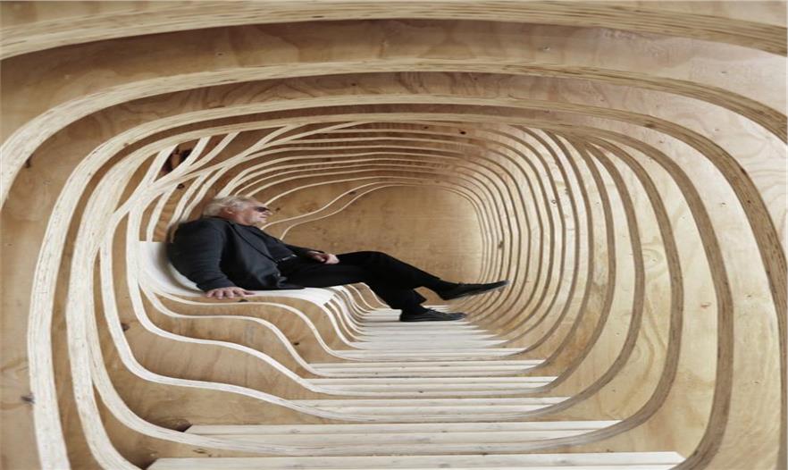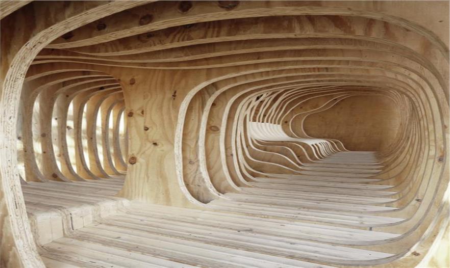 “READER”的搭建工作总共花了五天,材料则为松木的胶合板为主。建筑的内部主要是用云杉面板进行装饰贴面,整体搭建在三块基座板上,并用九支可活动的支脚支撑。