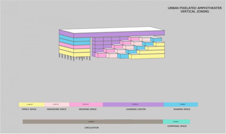 像素化的基座上包含了建筑的主要功能设施,其中有一个礼堂,家庭空间,一个青少年中心,美食广场,产品实验室和一些店铺。这部分体量就是一个“城市客厅” ,这是由其自身的不同部分组成,其中的五个柱子也增加了空间的大小,每一个都包含了一个不同的功能”并且被放置在相关的活动空间之间,这是为了获取最大化的使用效率”让用户体验。因此当人们沿一个柱子的方向行走时,游客会遇到类似的功能,但如果上下移动时,他们也会有一个横向功能的体验。