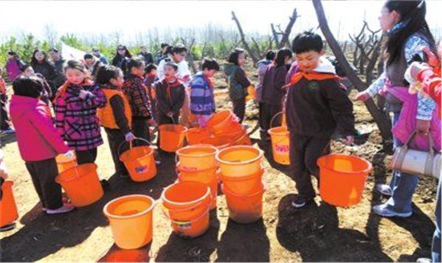 4月6日,在北京市海淀区,小学生们和院士一起为首都添新绿。
