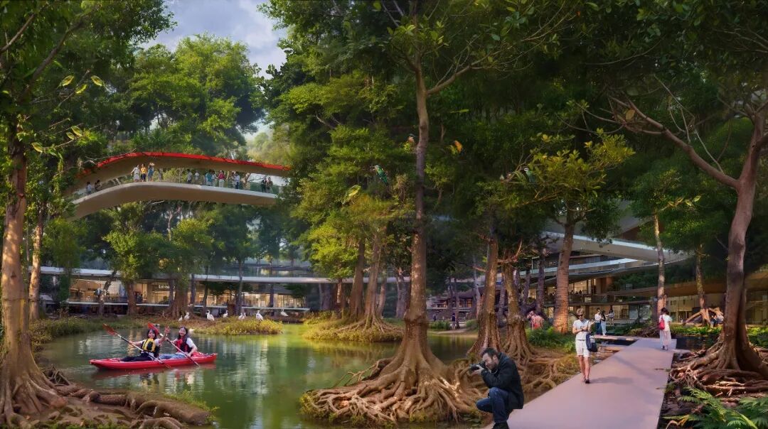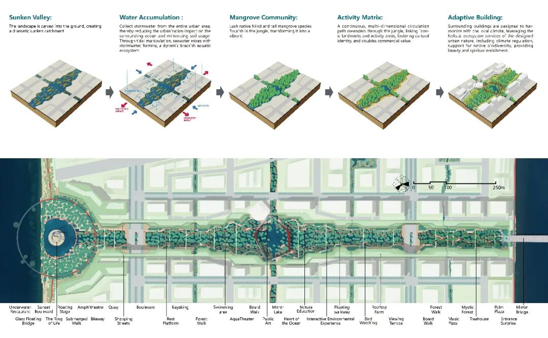 Nilad是当地具有代表性的红树林植物,被认为是马尼拉名字的来源。”JUNGLE NILAD(尼拉丛林)”致力于建立一个全球范围气候适应、韧性城市的愿景标杆。本方案通过建立下沉海绵谷地,收集全岛的雨水,从而减轻城市化对周边海洋的影响,并最大限度地减少填海造陆的土壤使用。通过潮汐调控,形成动态的咸淡水生态系统,营造由Nilad和高大的本土红树林组成的繁荣生境,将公园转变为一个充满活力、重新野化、低维护、沉浸式并具备负碳效应的都市绿洲。同时,建立在丛林中蜿蜒穿行的连续立体的慢行系统,串联标志性节点和活动区域,促进当地文化认同,翻倍商业价值。周围建筑的设计也与当地气候相协调,充分利用公园提供的全面生态系统服务,包括气候调节、维持本土生物多样性、提供美学享受和精神滋养等。