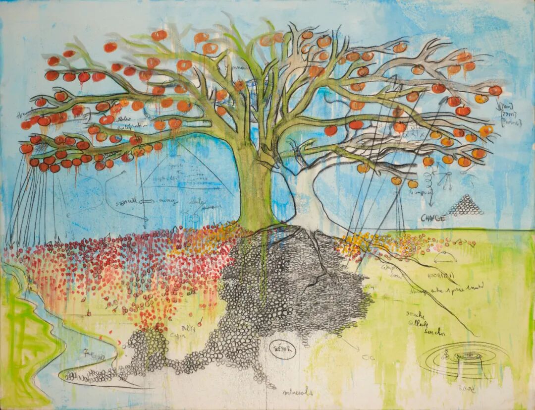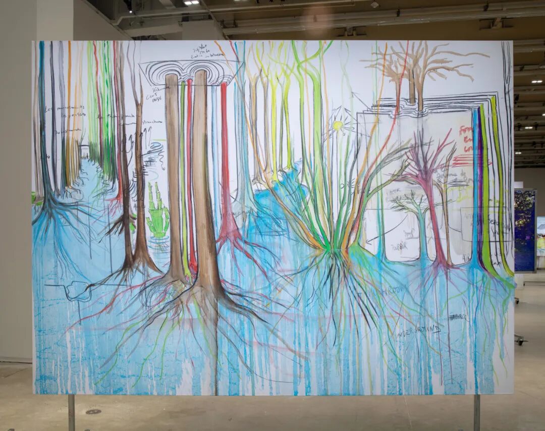 回看伊贝尔的创作生涯,更像是一场突破边界的冒险,作品涵盖绘画、行为艺术、装置等多种形式,且将艺术与数学、神经科学、农林学、历史、天体物理学等多学科深度融合。比如在绘画中,他以独特的视觉句法,用文字、图像和箭头等符号构建画面,讲述着自然、宇宙、生命的故事,把画布当作探索知识的黑板。他所秉持的观念是,知识分享是其艺术创作的核心要义,因为“艺术是了解世界的独特途径,它通过不同学科之间的交流对话,帮助人们以全新视角审视这个世界。”