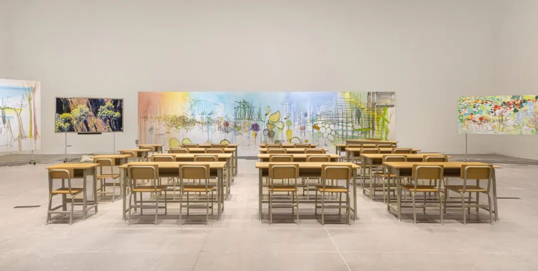 展览将树木、阳光和自然元素融入展览空间,40余幅画作及创作于景德镇的瓷板绘画置于带轮支架上,宛如学校黑板。伊贝尔邀我们落座,阅读、学习,探问他构筑的智趣世界:自然、宇宙、数学、建筑与诗歌。你可以穿行在一间间“课堂”中,或驻足长椅与课桌前凝视画作。展览犹如一所新形态学校,观者成为学子,面对敞开的无限可能。