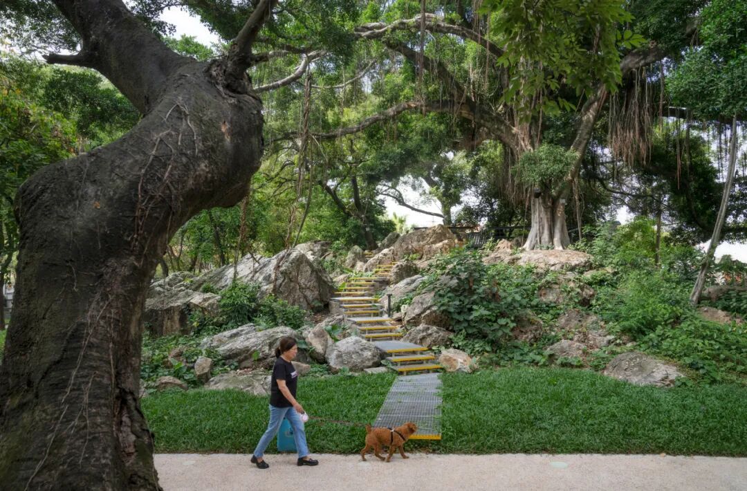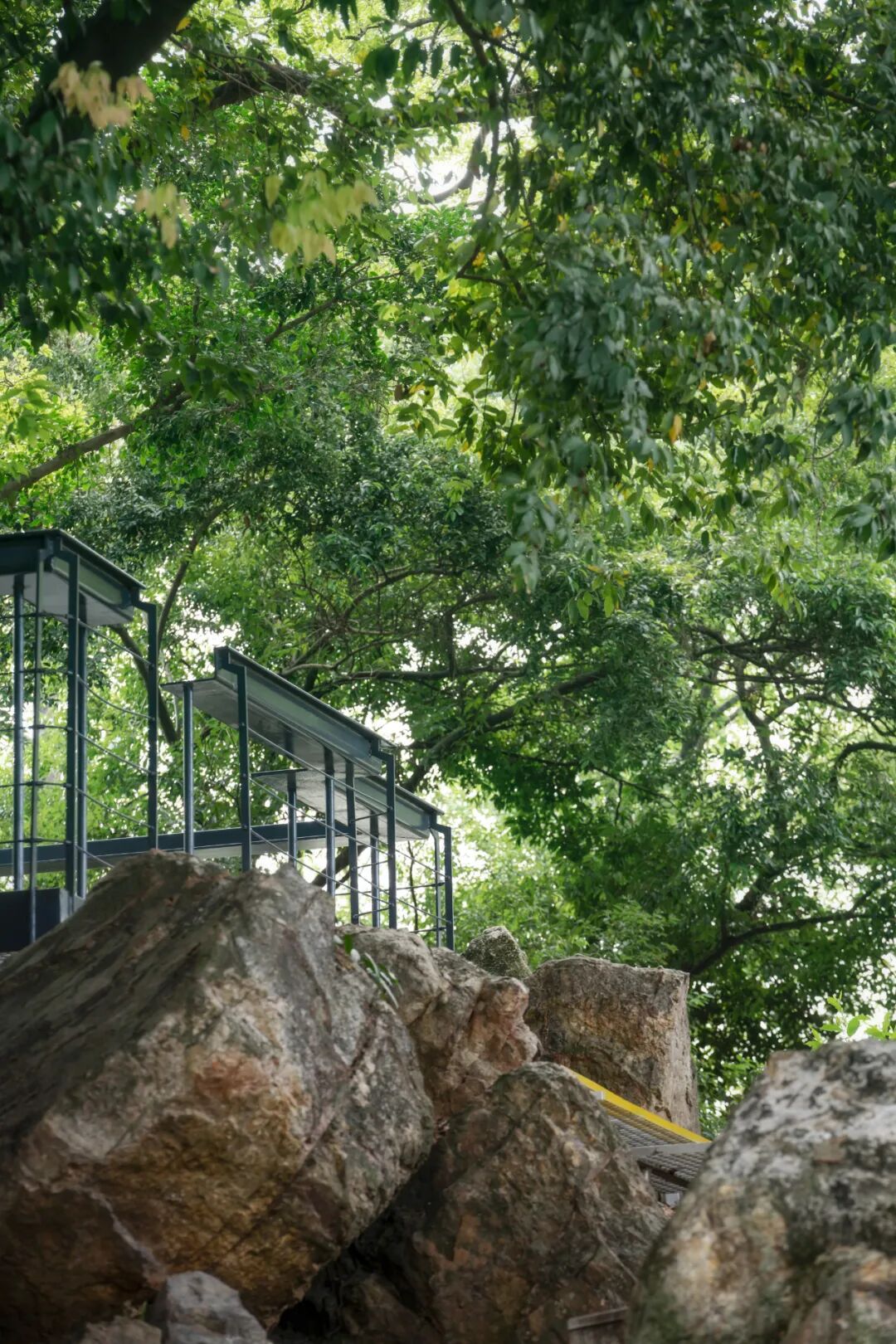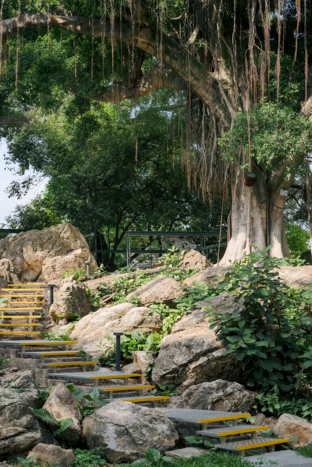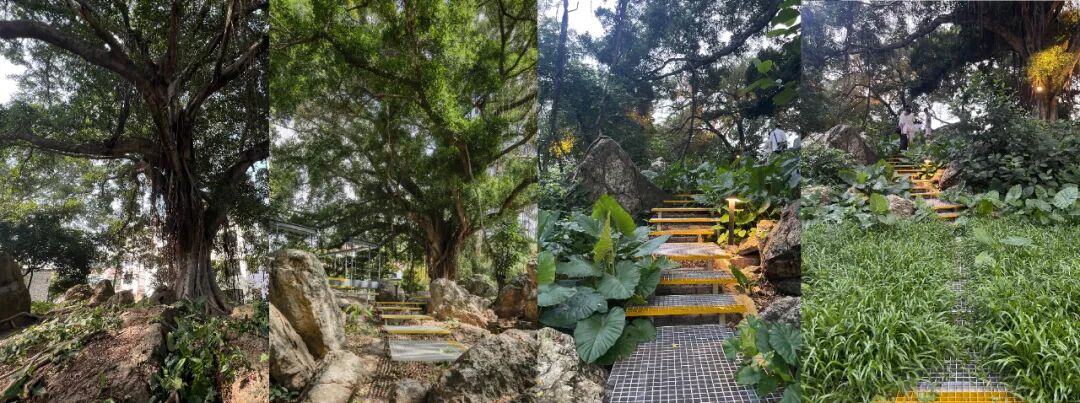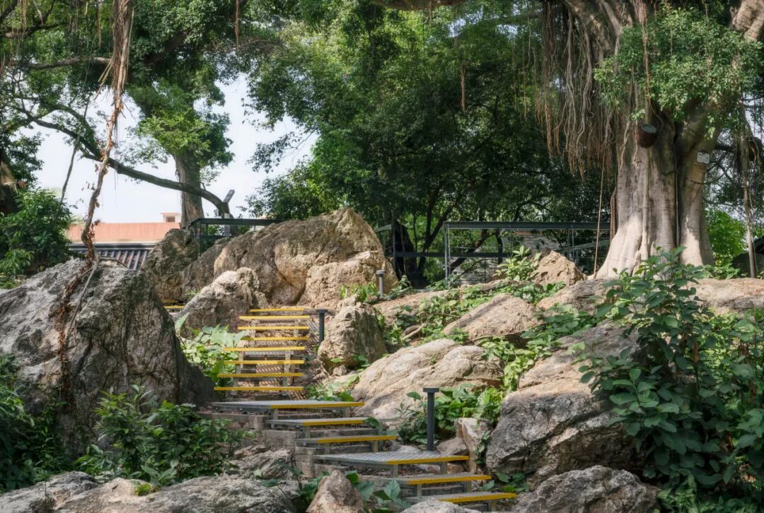位于此处的石头山、天后宫,是顺德原始海岸的遗址所在地。设计充分尊重原本存在于此的古树与巨石共存的奇景,保留原有的场地形态,新增内容依然延续着“微介入、轻改造”的原则进行设计,既能增加游人进入其中体验互动,又能不破坏大树根系与千年山石表皮。