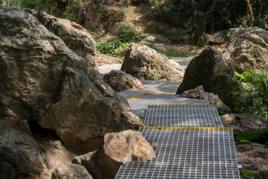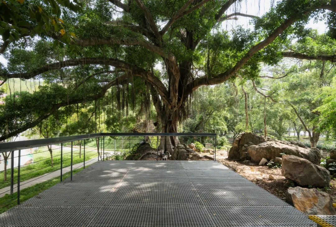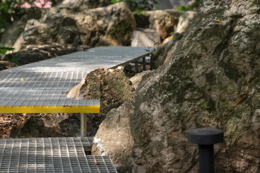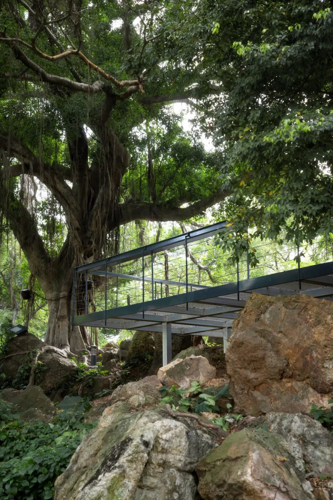 我们通过对场地的踏勘建模,找到两处适合的区域设置了休息平台,由原场地石块进行拼砌,做到与原生环境相互融入。平台与步道使用了石钢格网栈道形式,每平米仅需四个支点,每个支点占地面积约为5cm*5cm,避免过度接触山石表皮。通过精心设计的观景视线,将百年榕树与嶙峋巨石转化为极具空间体验感的景观装置。