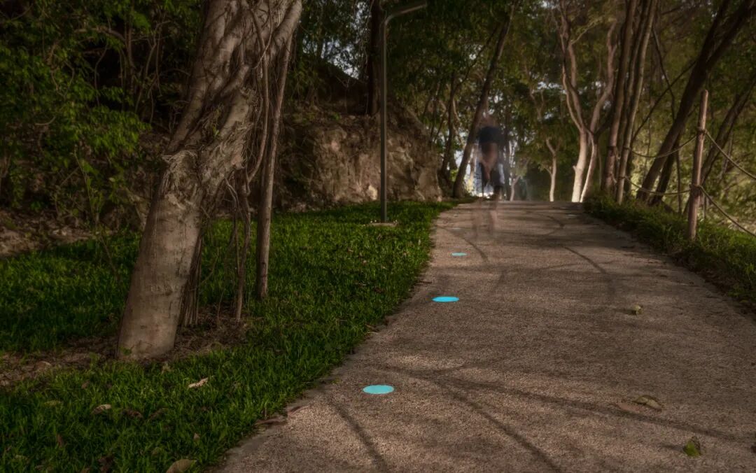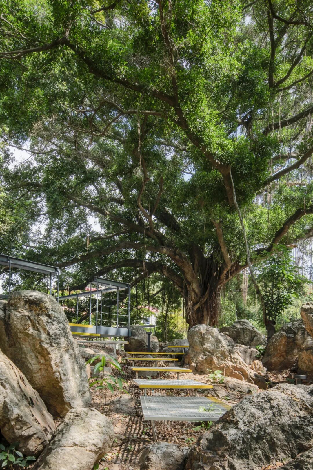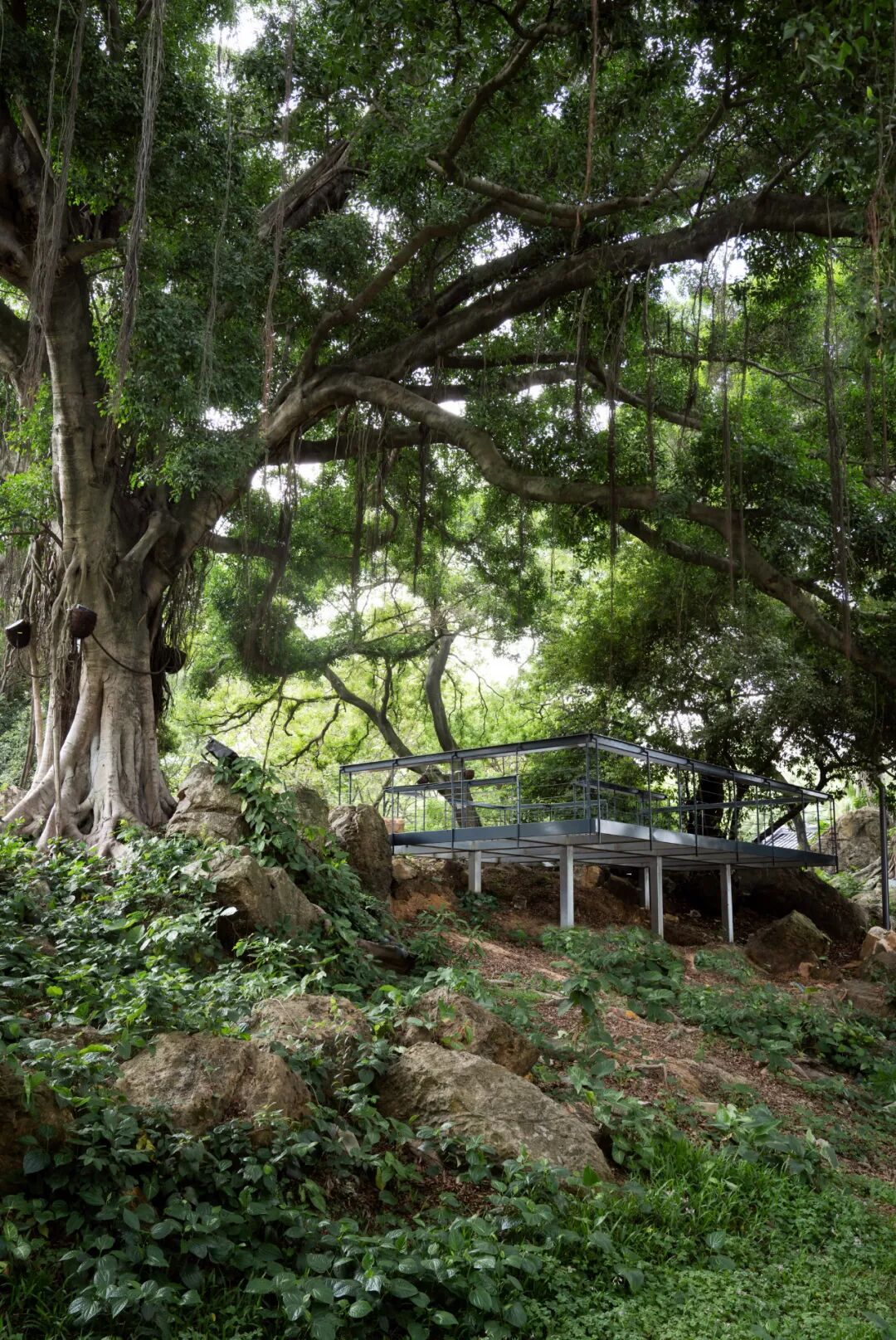 我们通过对场地的踏勘建模,找到两处适合的区域设置了休息平台,由原场地石块进行拼砌,做到与原生环境相互融入。平台与步道使用了石钢格网栈道形式,每平米仅需四个支点,每个支点占地面积约为5cm*5cm,避免过度接触山石表皮。通过精心设计的观景视线,将百年榕树与嶙峋巨石转化为极具空间体验感的景观装置。