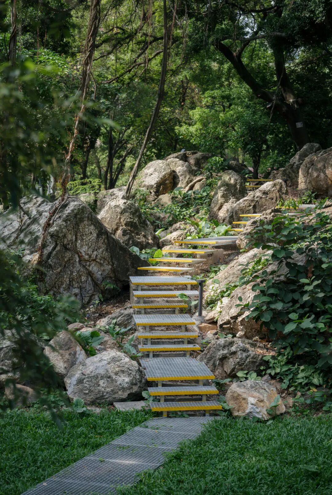 改造后的石山公园,生动诠释了“低干预”设计理念与景观生态学的完美融合,步道及平台并没有耽误石山上原生植物的生长轨迹,通过预留的缝隙,在阳光雨露的沐浴下,植物依然茁壮向上生长。
