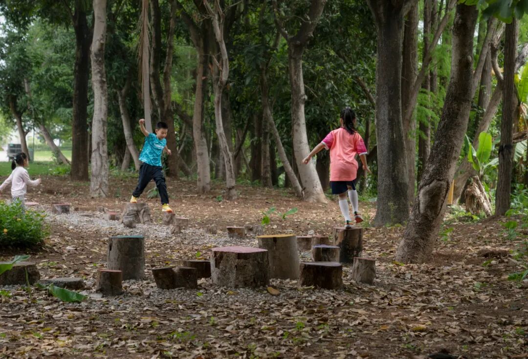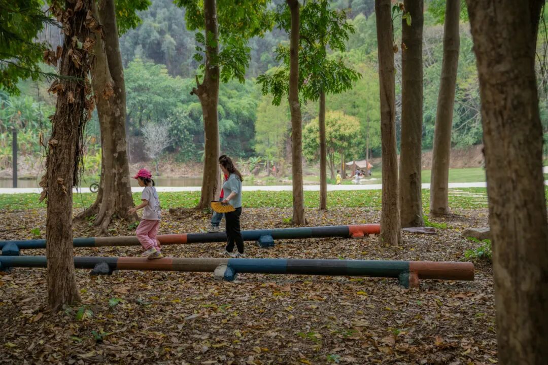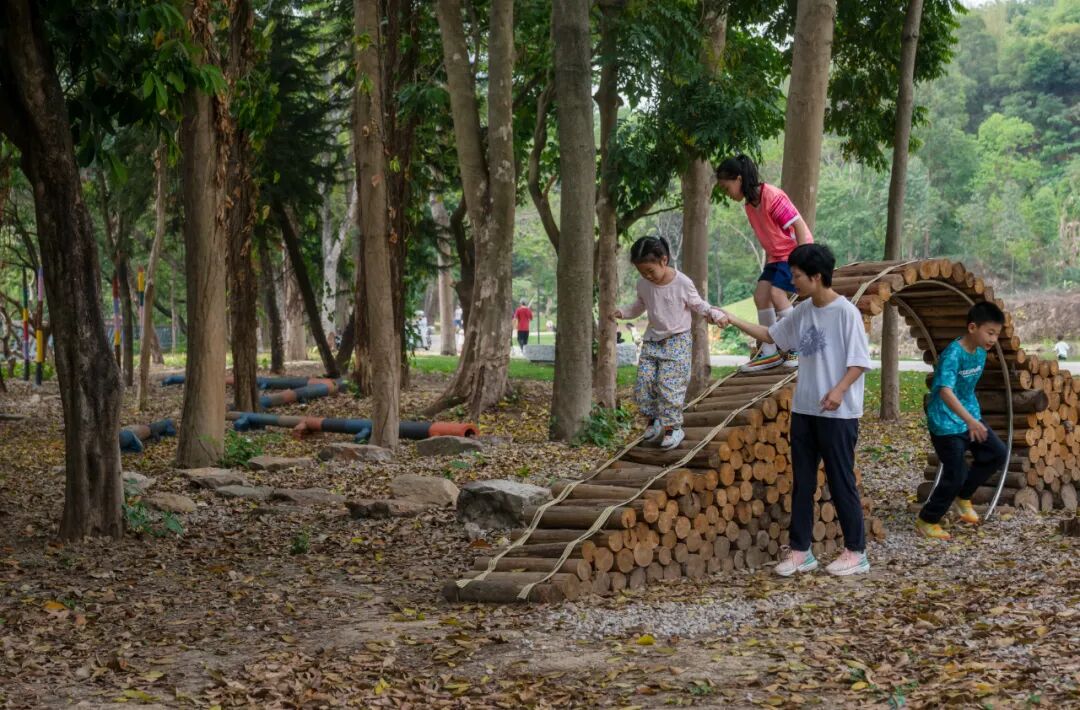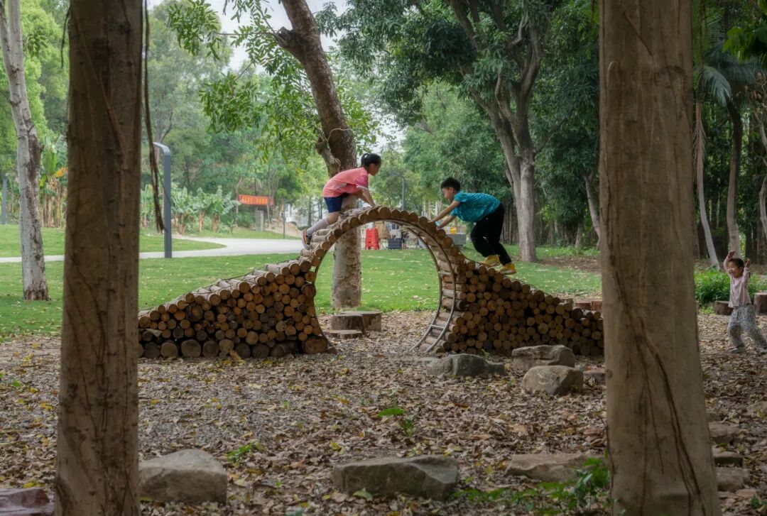 在城北涌心水湖段河岸绿荫区域的改造施工过程中,清理出来6根7米长的废旧水泥电杆、数十条倒伏的枯木树枝,以及苏岗公园停车场拆除后成堆的混凝土石块,经过多方协作,废弃电杆化身为惊险有趣的独木桥,枯木经过色彩处理变身为七彩攀爬架,混凝土块化作林下生态汀步,由混凝土与红砖碎块组成的再生石堆砌出充满童趣的跳石步道。这个仅用3天便完成的300平方米野趣乐园,以其原生态的美学风格和互动性体验,生动展现了废弃资源循环利用的无限可能。