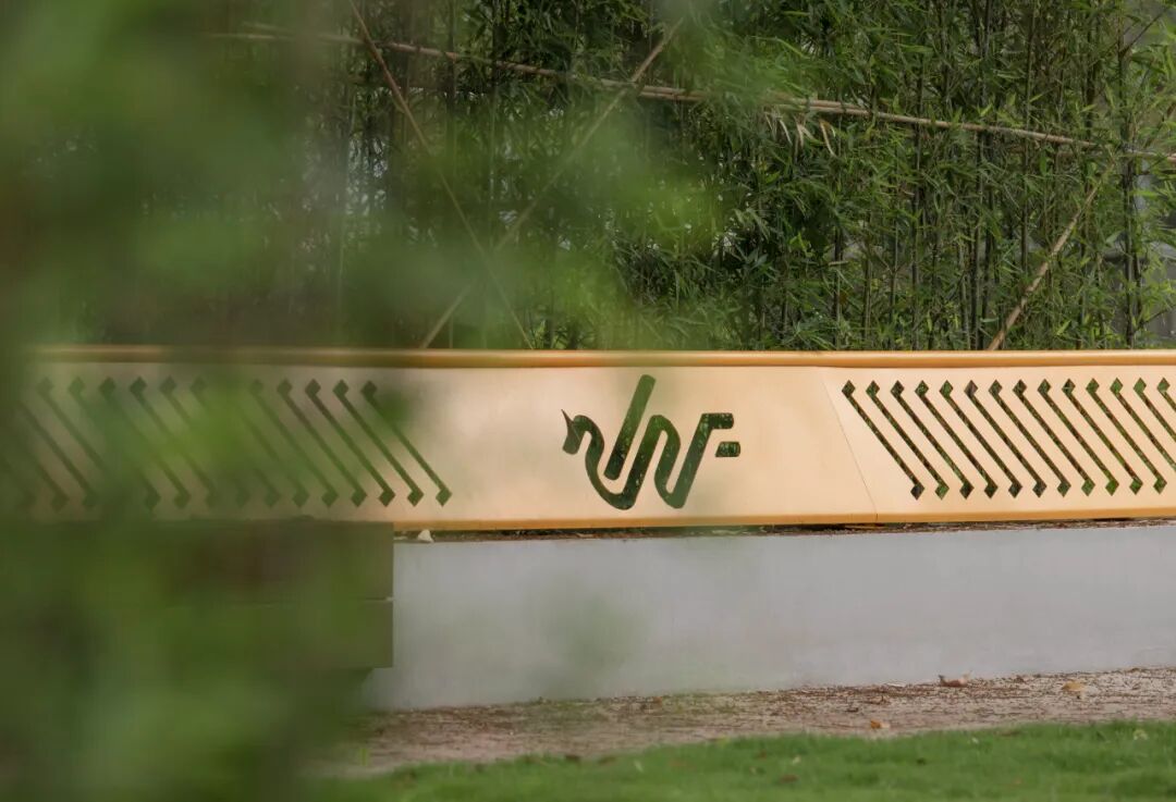 源自"苏岗有游龙"主题的视觉标识系统,以蓝绿色水系文化与场地暖黄色调形成鲜明对比,流畅的游龙线条巧妙引导游客深度探索。