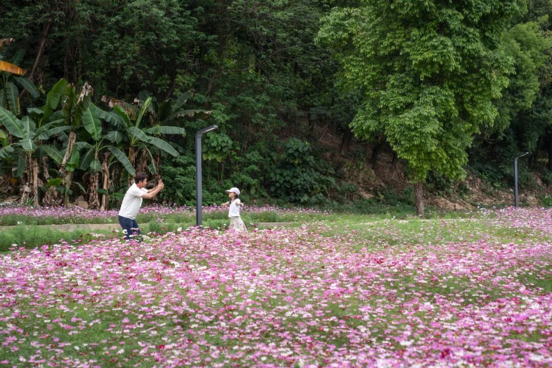 五月,园路沿线的格桑花海正在怒放,与富有地方特色的村屋彩绘相映成趣,共同构建成兼具自然野趣与文化特色的游览体验。花海区域地块属于传统认知中的“边角料”城市荒地,我们使用撒草籽的简单手法,既保留了地块原有的自然野趣,又创造了令人惊艳的季相变化景观。