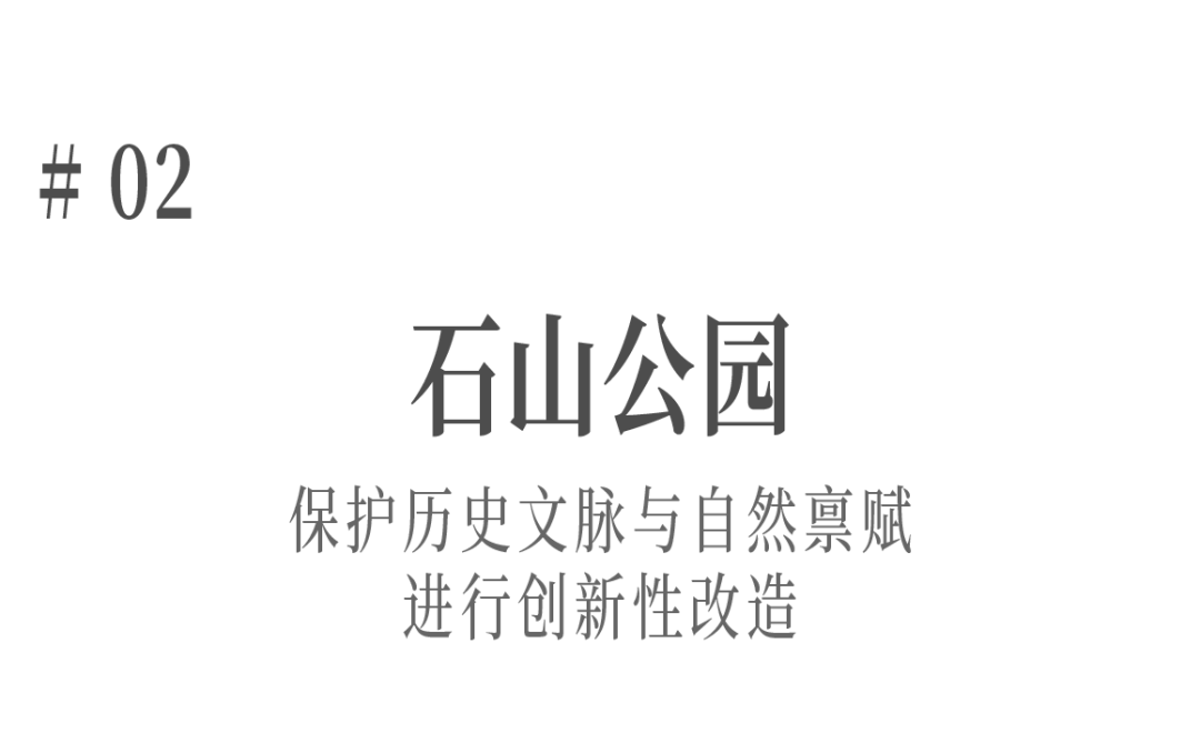 石山公园部分的设计策略为:尊重、保留、发扬。在保护场地历史文脉与自然禀赋的基础上进行创新性改造。