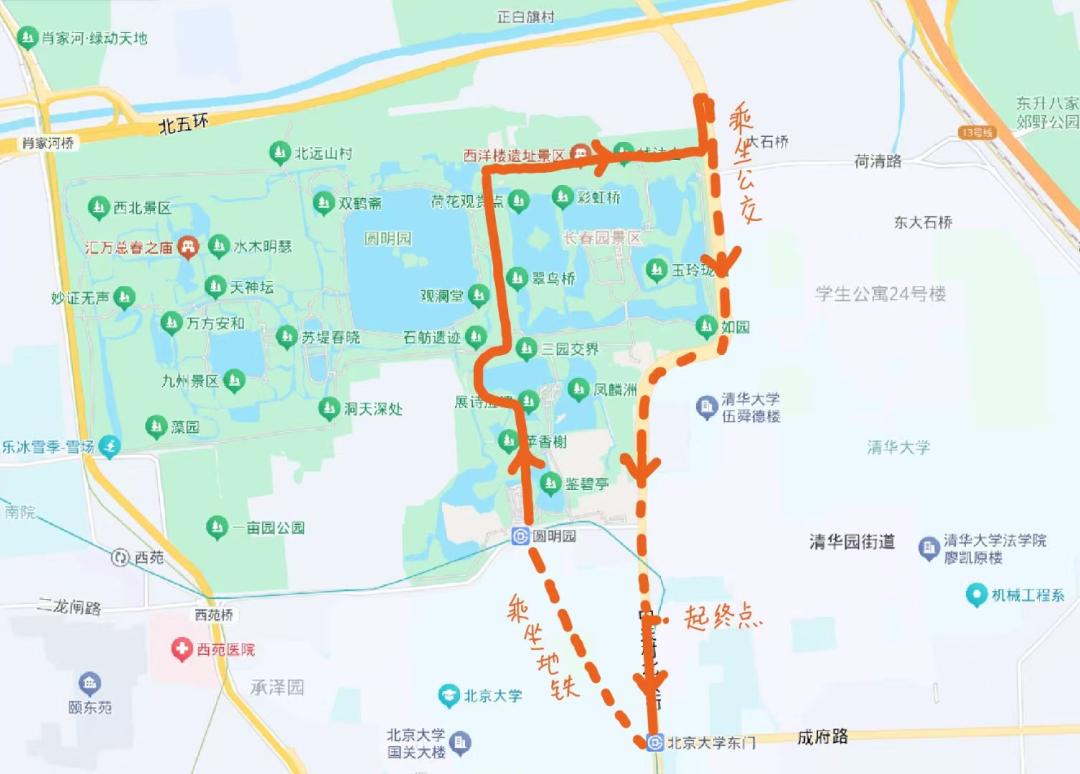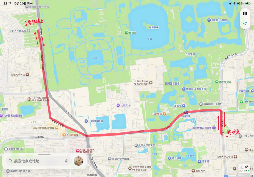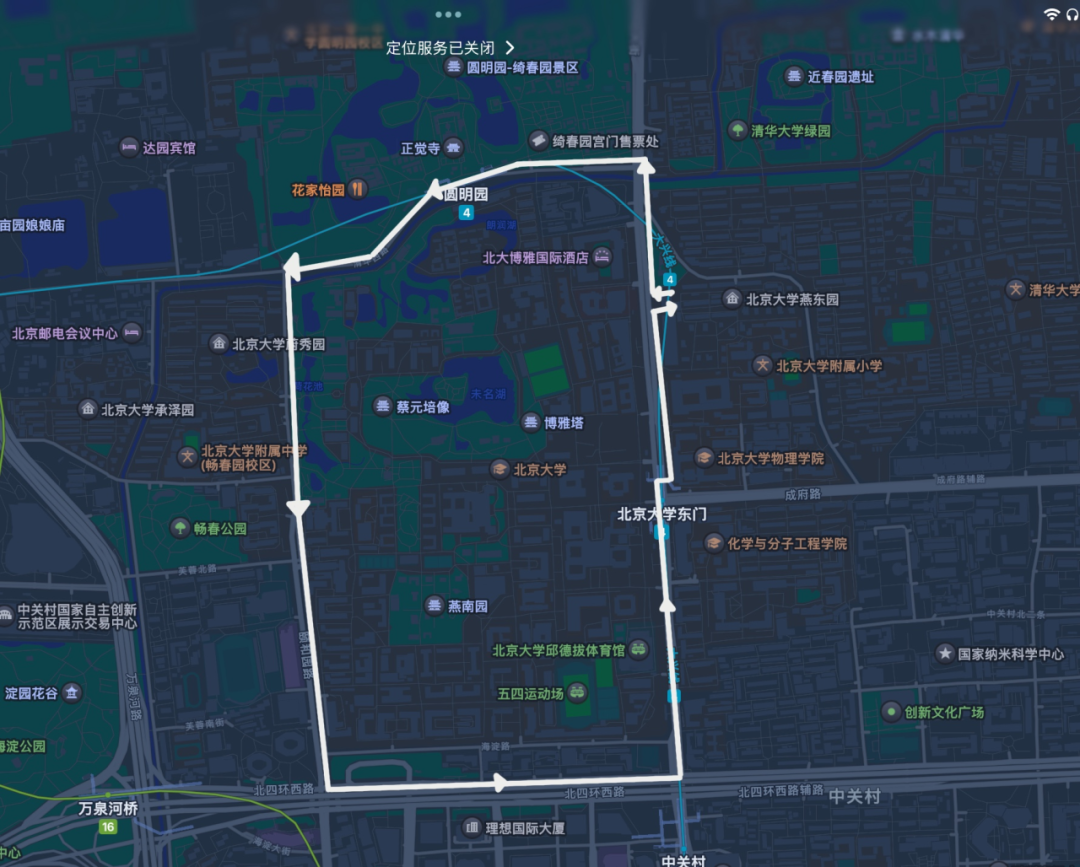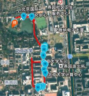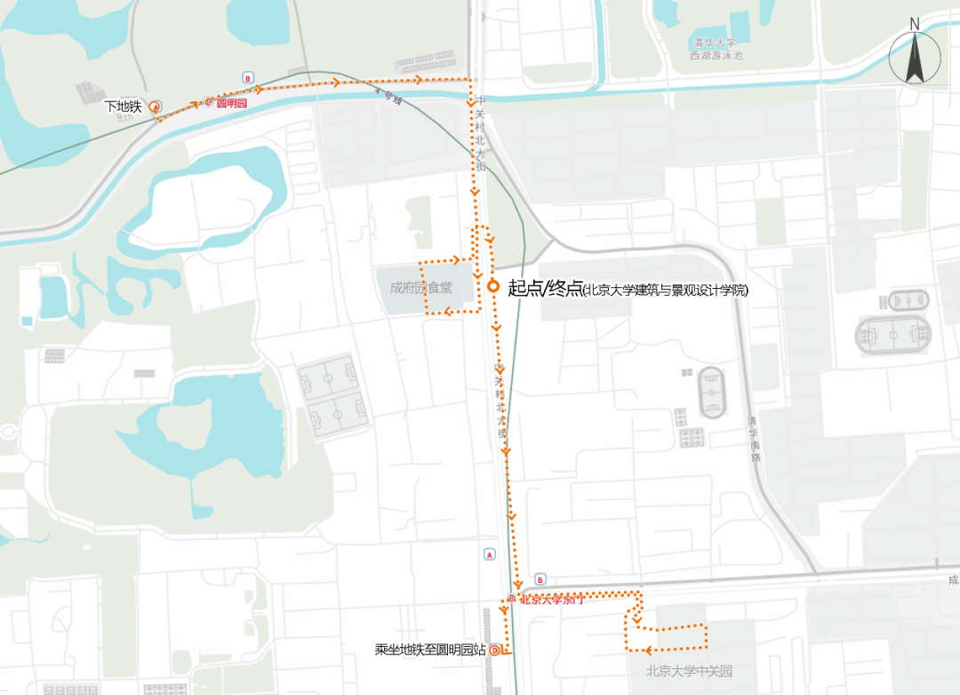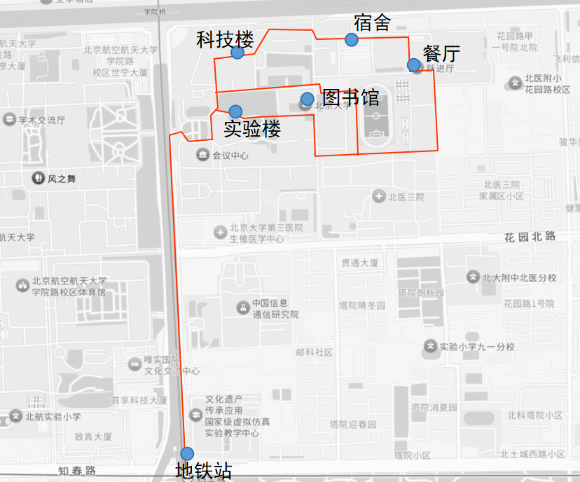 北大景观楼门口——景观楼公路——景观楼入口——景观楼一楼——景观楼一楼厕所——景观楼二楼草图咖啡——景观楼槐树广场——景观楼三楼教室