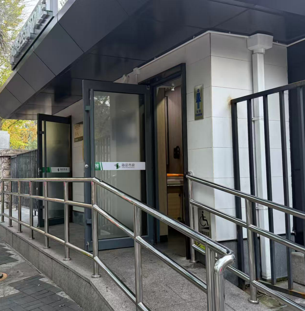 北大西门外的无障碍卫生间:开门方向由向外开到向内开,并且门适当拓宽(我们已打电话给12345反应,那边说后续改善女厕所门口的开门方向)