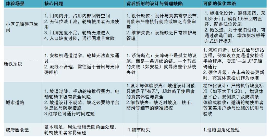 我们应该考虑所有群体在日常环境中的使用需求,甚至引入他们的参与和评价。只有通过体验员的亲身实践,才能发现诸如坡道材质过滑、扶手过高或过低、低位服务台实际操作不便等“隐形”问题。