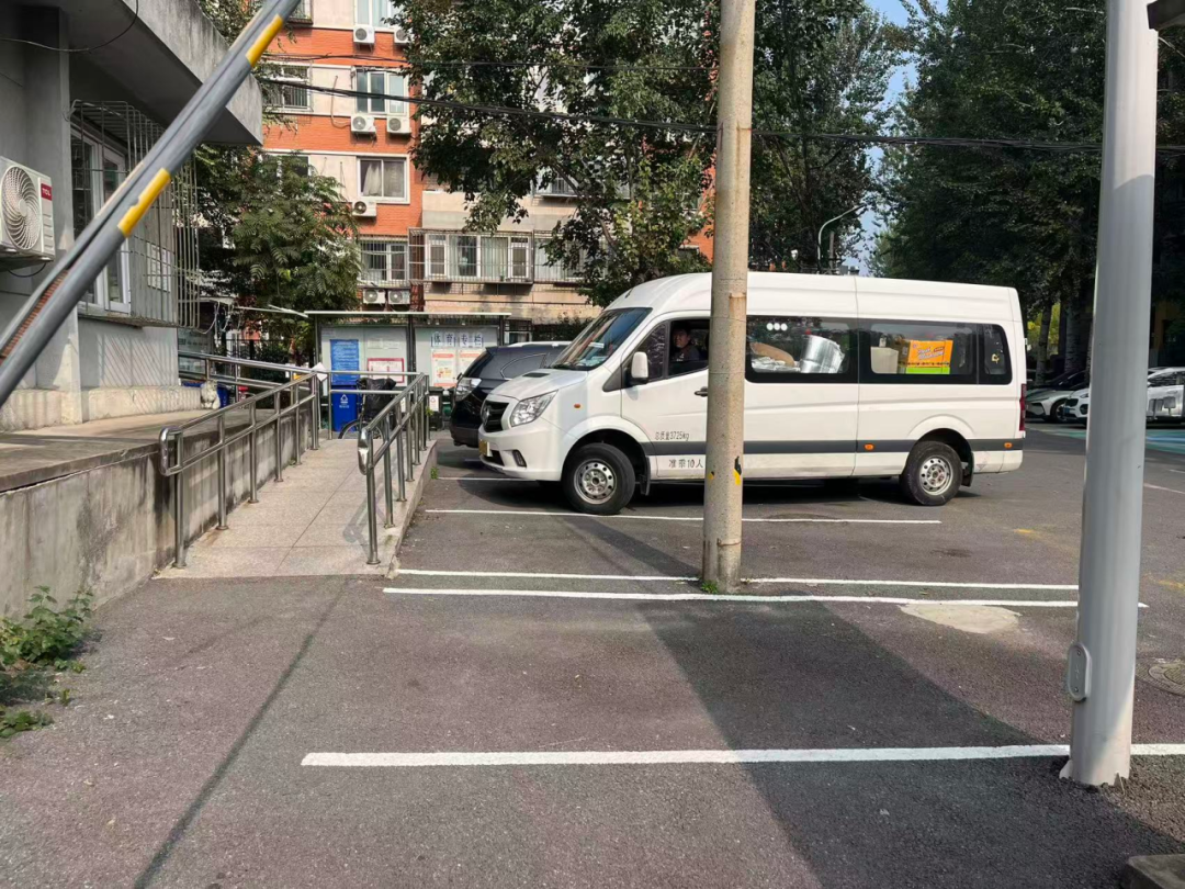 畅春园社区。西院南门新增停车位,与社区居委会无障碍坡道出入口形成冲突,如果停放了车辆,轮椅需要绕开车辆走一段路才能出来。