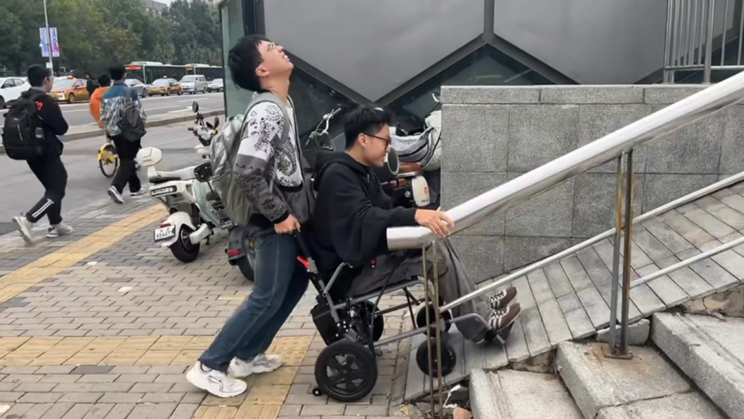 轮椅体验:建筑前的陡坡让轮椅冲向车流