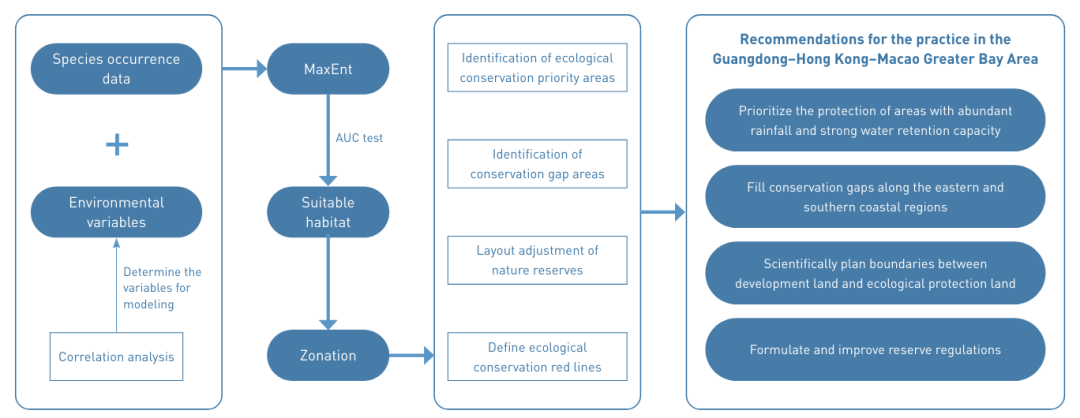 识别重点陆生野生动物的生态保护优先区对于生物多样性保护具有重要意义。然而,现有研究往往将单一类群作为研究对象,忽略了生物多样性的整体特征和相互关系。本研究聚焦粤港澳大湾区及其32种重点陆生野生动物,综合运用MaxEnt与Zonation模型预测生态保护优先区,进而与现有自然保护区叠加分析,以识别保护空白区域并提出自然保护区优化方案。结果表明:1)降水季节性对物种潜在分布具有显著影响,物种适宜栖息地主要集中在降水充沛且蓄水性较好的区域;2)生态保护优先区分布主要位于肇庆市北部和中部山林区域,江门市沿海区域,珠海市中部至南部沿海区域,中山市中部、东北部至沿海区域,惠州市中部至沿海区域,东莞市东南部,深圳市中西部及沿海区域,澳门北部及南部区域,以及香港沿海区域;3)Zonation预测的生态保护优先区域与大部分已建立的自然保护区重合,但在大湾区东部、南部沿海仍存在保护空白区域。本研究的结果可对其他地区推进生态保护提供有益参考和借鉴,有助于将气候变化及人类活动因素纳入保护区规划工作中,为生物多样性保护提供有效方法,为自然保护管理者提供科学决策依据。