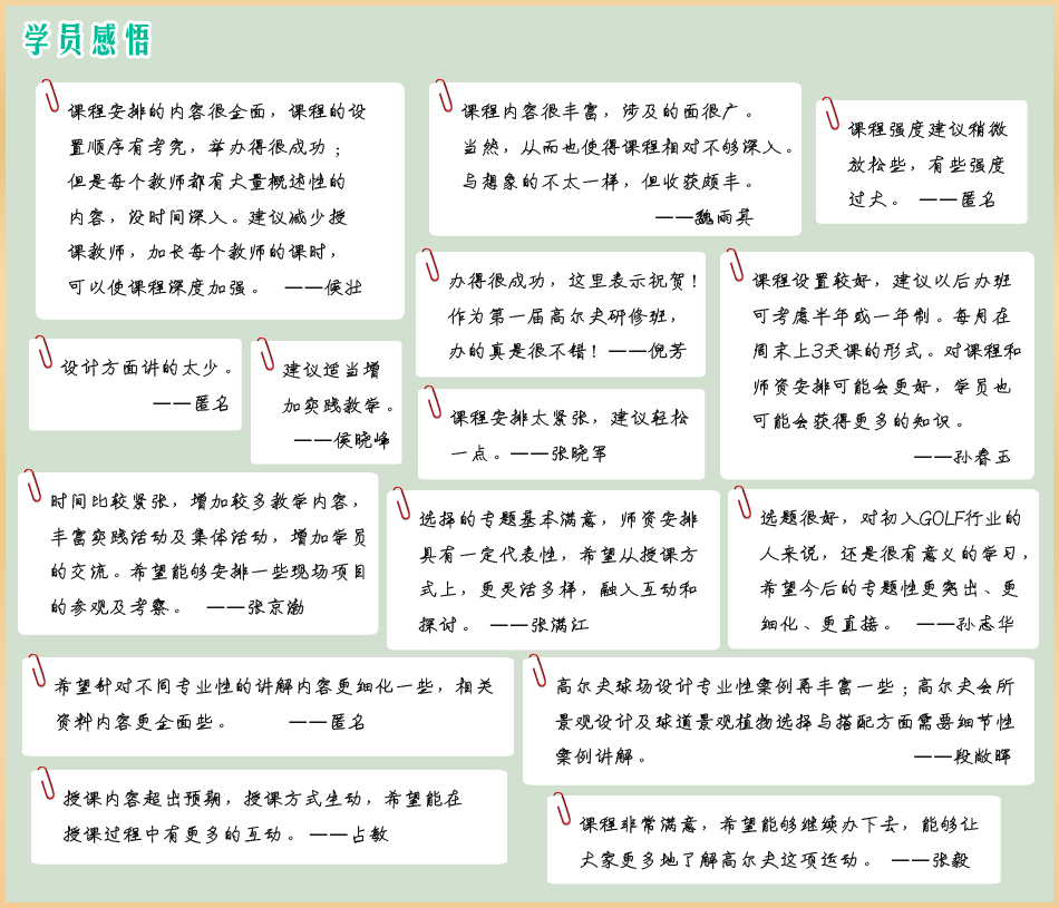 本期研修班从高尔夫概论与历史文化研究、高尔夫产业国际前沿理论与案例研究、高尔夫景观营造、高尔夫球场设计、综合地产项目与高尔夫球场设计、高尔夫景观植栽配置与草坪、高尔夫项目与生态可持续发展、高尔夫球会经营与场务管理等8个主要方面展开了授课内容。