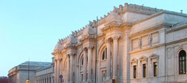 纽约大都会博物馆是美国最大的博物馆, 1870 年1月31日博物馆在纽约第五大道 681号原多德沃思舞蹈学校旧址正式建立。1880年迁至现址。纽约的大都会博物馆背依纽约中央公园,闹中取静,环境幽雅。但展出内容却丰富多彩,体现了资金足、气派大的美国风格。整座的2460年前的埃及古墓移置在馆内专建的大厅中巨型玻璃罩里,可谓镇馆之宝。服饰馆也堪称世界之最。[详细]
